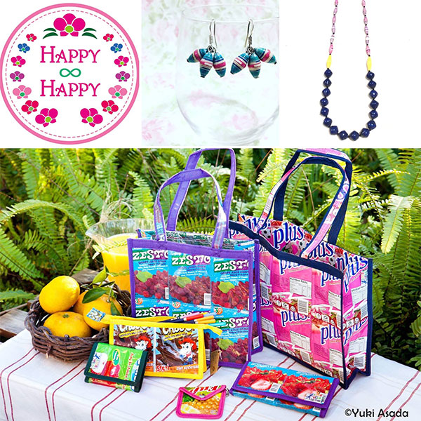 フェアトレードのセレクトショップ「ハッピーハッピー」です。カラフルでポップなアクセサリーやカバンをお届けします!ブレスレット、マスクチャーム作りが登場!