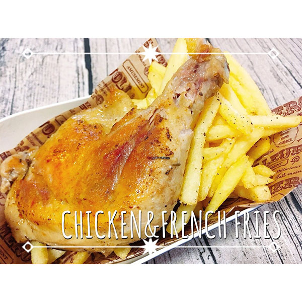 ハーブオイルで低温調理して焼くチキンは香りと柔らかさが特徴です。フレンチフライもハーブオイルで揚げます。